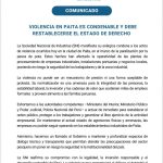Por lo tanto, la organización instó al Ministerio del Interior, el Ministerio Público, el poder judicial, la Policía Nacional de Perú a actuar de inmediato para restaurar el orden público, proteger a los trabajadores y garantizar el libre ejercicio de la actividad comercial. «Si se mantienen el estado actual de las agresiones físicas y las amenazas, las empresas no podrán continuar operando en los establecimientos industriales de Paita», dijeron.